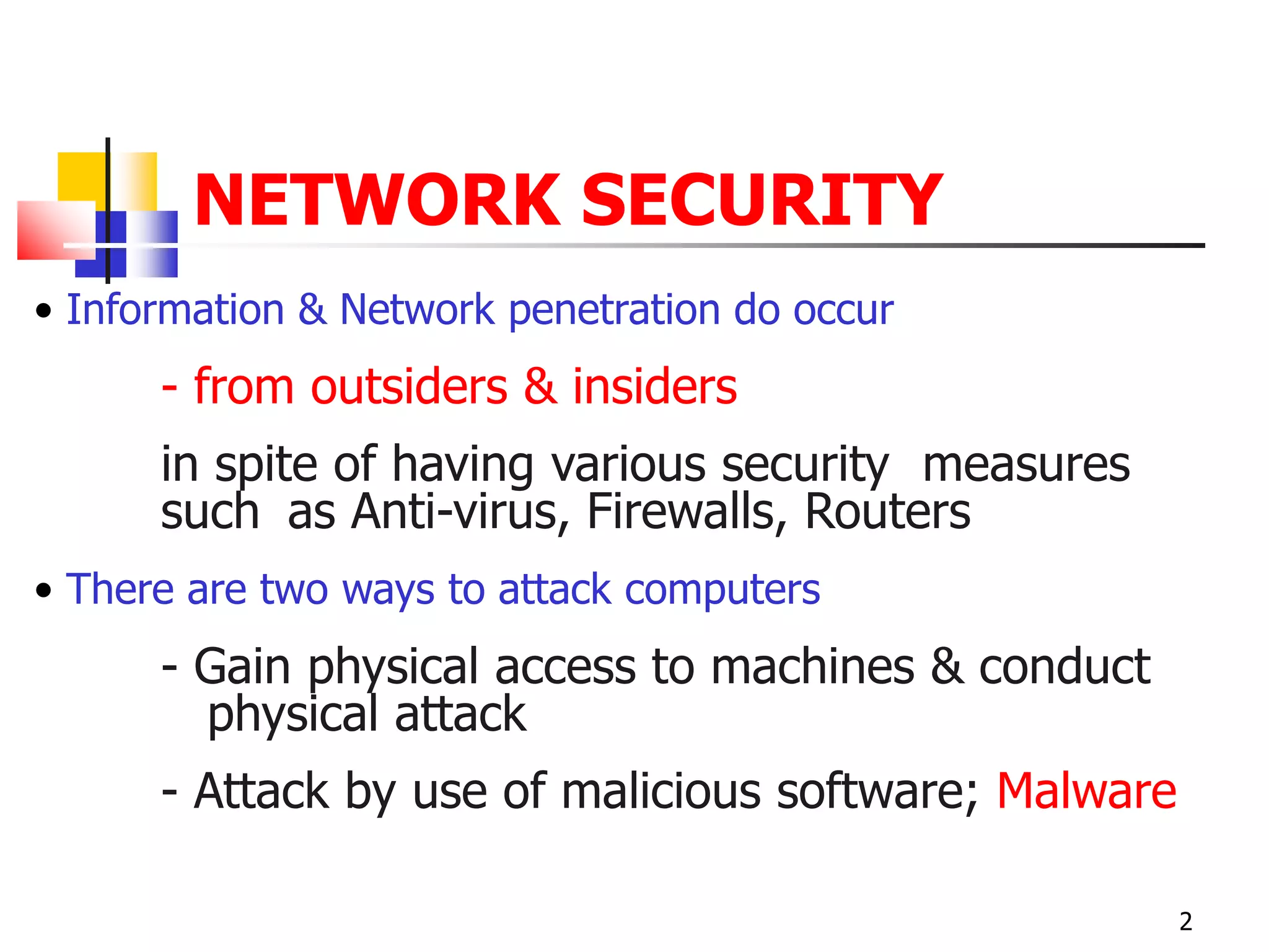 The document covers network security and system administration, discussing various threats like external and internal attacks despite existing protective measures. It highlights the importance of confidentiality, integrity, availability, and access control, alongside countermeasures like firewalls and intrusion detection systems. Furthermore, it addresses specific attacks such as denial of service and distributed denial of service, emphasizing the need for effective security policies and emergency responses.