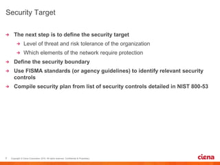 The document provides details on controls for network security assessments. It discusses the differences between certification and accreditation, and how risk tolerance must balance threats against protection costs. It also lists various access, identification and authentication, configuration management, and system integrity controls, and references how each control is assessed. The controls are evaluated to ensure the system or network is properly monitored, authenticated, updated, and protected from unauthorized access and malware.