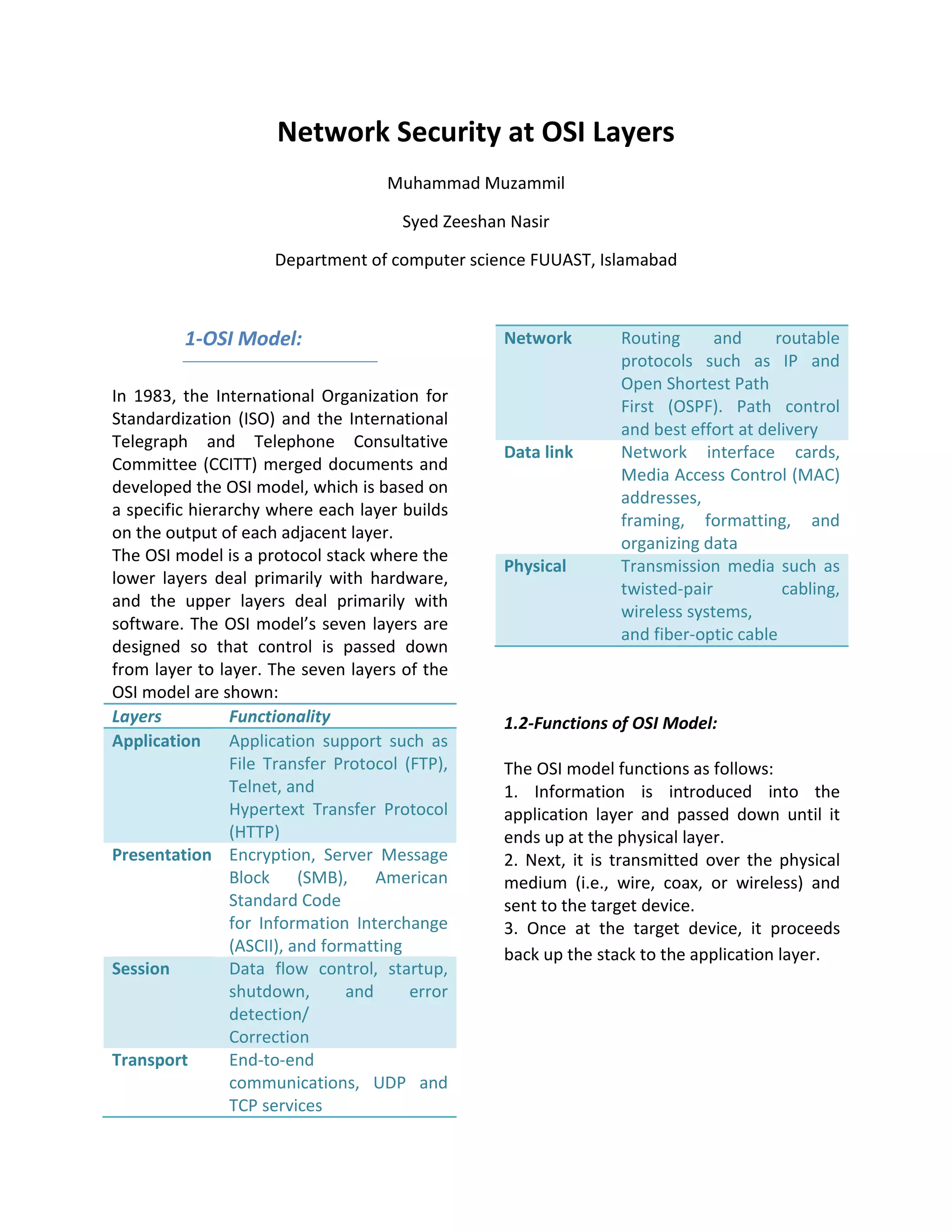 The document summarizes network security at the seven layers of the OSI model. It describes attacks that can occur at each layer, from the application layer down to the physical layer. It also lists some common countermeasures that can be implemented at each layer to enhance security, such as virus scanners, encryption protocols, access control systems, and virtual private networks. Overall, implementing additional security controls and limiting unnecessary access helps strengthen defenses across all layers of the OSI model.