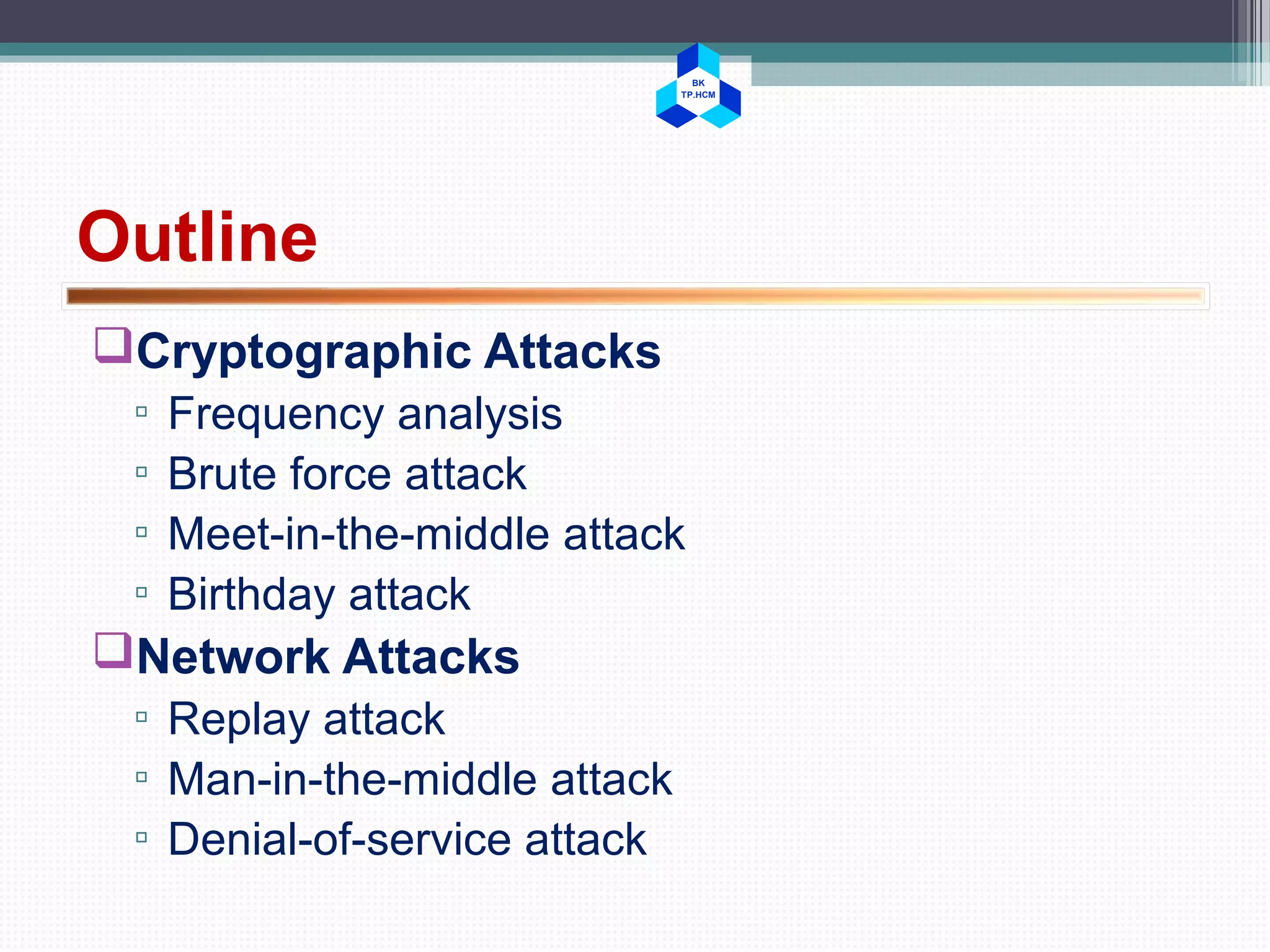 This document outlines various cryptographic and network attacks including frequency analysis, brute force attacks, meet-in-the-middle attacks, birthday attacks, replay attacks, man-in-the-middle attacks, and denial-of-service attacks. It provides details on how each attack works and potential defenses against attacks like using authentication, random session tokens, and timestamping.