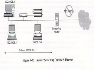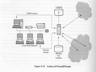 The document discusses security issues in networks and distributed systems. It describes possible network security threats like wiretapping, impersonation, message integrity violations, hacking, and denial of service attacks. It also discusses network security controls like encryption and authentication methods. Specifically, it covers Kerberos, PEM, and PGP for authentication and encryption. It describes different types of firewalls - screening routers, proxy gateways, and guards - and their functions in securing networks. However, it notes that firewalls are not complete solutions and have their own security issues.