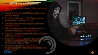 The document discusses network and data security. It notes that there is a hacker attack every 39 seconds and over 300,000 new malware are created daily, posing significant threats. It then defines network security and data protection, and discusses various technical and organizational strategies that can help improve security, such as firewalls, antivirus software, access control, encryption protocols like WPA2, and employee training. The document emphasizes adopting a holistic, next-generation approach to endpoint security to effectively combat modern cyber threats.