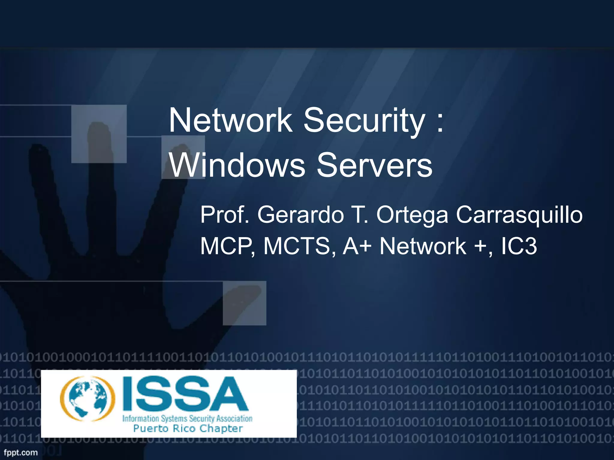 This document discusses network security and auditing Windows servers. It provides background on the speaker and defines information security. It outlines fundamentals of information security like the triangle of security. It describes important documents, regulations and standards, and the purpose of auditing Windows servers for compliance, risk reduction, health, and performance. It discusses evaluating event logs, active directory, user account properties, and group policy settings. It recommends tools for auditing like Wireshark, GFI Languard, Nessus, and OpenVas and maintaining server documentation, backups, and patches.