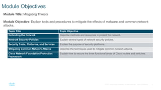 The document outlines strategies for mitigating threats in networking security, focusing on the role of security professionals, security tools, policies, and incident response. It details the responsibilities of network security roles, the importance of keeping abreast of current threats, and various types of security certifications. Additionally, it describes network security policies across different domains and highlights the necessity of utilizing a variety of security tools and platforms to enhance network protection.