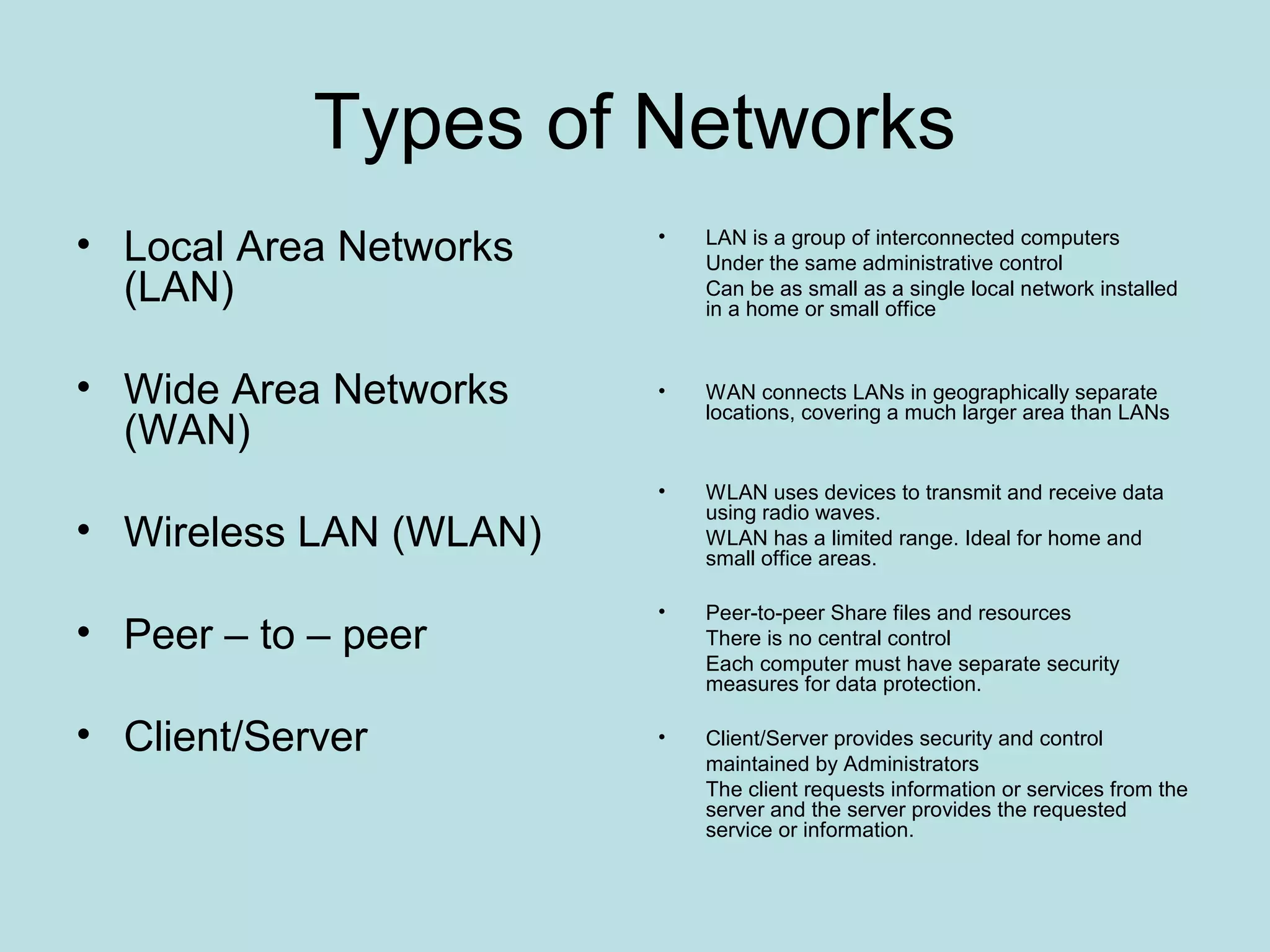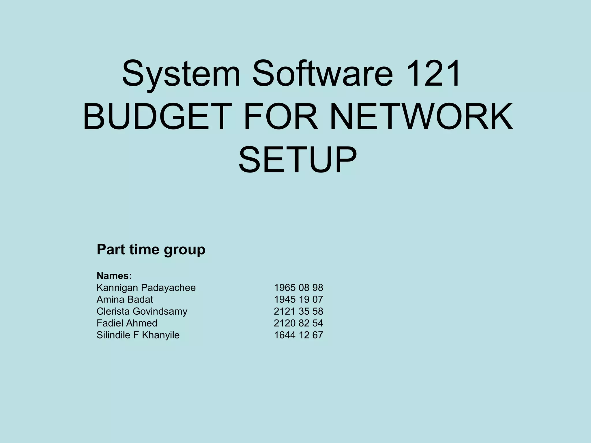 The document provides a budget and plan for setting up a network for a part time group, including details on types of networks like LAN, WAN, and wireless networks. It discusses hardware and software requirements like switches, routers, cables, and access points. The budget section lists proposed equipment purchases like a multi-function device, wireless cards, and an ADSL subscription from MWEB to connect the network.