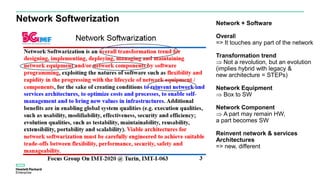 The document discusses network softwarization, detailing its evolution from legacy systems to incorporating software-defined networking (SDN) and network function virtualization (NFV) within cloud environments. It highlights the driving forces behind this shift, such as incumbent operators, vendors, and the emergence of startups, as well as the implications for network architecture, resource sharing, and operational models. Additionally, it emphasizes the potential for new business models and challenges regarding standardization and security in the evolving landscape.