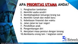 Dokumen ini membahas tentang prioritas keuangan individu, pentingnya investasi dan pengelolaan uang untuk mencapai kebebasan finansial, serta dampak inflasi terhadap nilai uang. Disarankan untuk menabung di reksadana dan menghindari gaya hidup konsumtif agar dapat mempersiapkan masa pensiun dengan baik. Selain itu, dijelaskan juga tentang peluang bisnis dalam sistem menabung dan potensi penghasilan dari berbagai jenis premi asuransi.