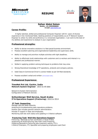 This resume is for Safeer Abdul Salam, seeking a position as an IT Network System Engineer. He has over 8 years of experience in fields including network administration, IT support, and oilfield operations. His professional strengths include problem solving, relationship building, and strong technical skills. His experience includes roles as a Network System Engineer and IT support roles in Saudi Arabia and India. He has multiple technical certifications and speaks several languages.