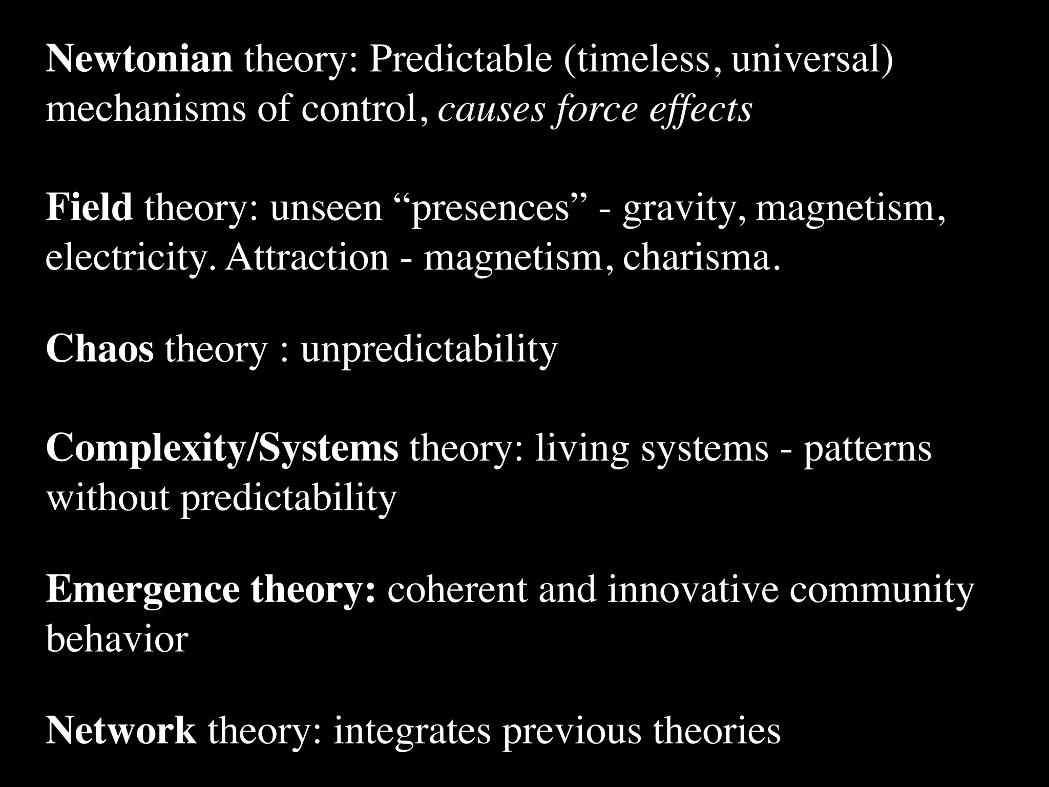 The document discusses several theories related to networks and relationships. Newtonian theory focuses on predictable mechanisms of control while field theory introduces unseen forces like gravity. Chaos theory emphasizes unpredictability. Complexity/systems theory examines living systems that form patterns without predictability. Emergence theory looks at coherent and innovative community behavior from relationships. Network theory integrates these previous theories. The document then outlines seven characteristics of robust networks: environmental sensitivity, absence of centralized control, individual agency, emergence through self-organization, scale-free communication, diversity, and innovation/adaptation.