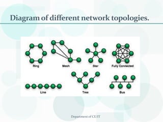This document discusses and compares several common network topologies: bus, ring, star, mesh, and tree. The bus topology connects all devices to a central backbone cable. The ring topology connects all devices in a closed loop. The star topology connects each device to a central hub using a point-to-point connection. The mesh topology connects each device to every other device, providing redundancy. The tree topology combines multiple star topologies connected by a central bus, allowing expansion while managing complexity. Each topology has advantages like ease of use or expansion, and disadvantages like single points of failure or management difficulties.
