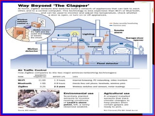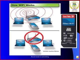 The document provides an overview of recent trends in networking, including Local Area Networks (LAN), Wide Area Networks (WAN), Bluetooth, Wi-Fi, Zigbee, and concludes with a thank you and bibliography. It discusses LAN as a high-speed network within a building or campus, and WAN as a network covering a broader geographic area. It also provides technical details and comparisons of Bluetooth, Wi-Fi, and Zigbee wireless technologies.