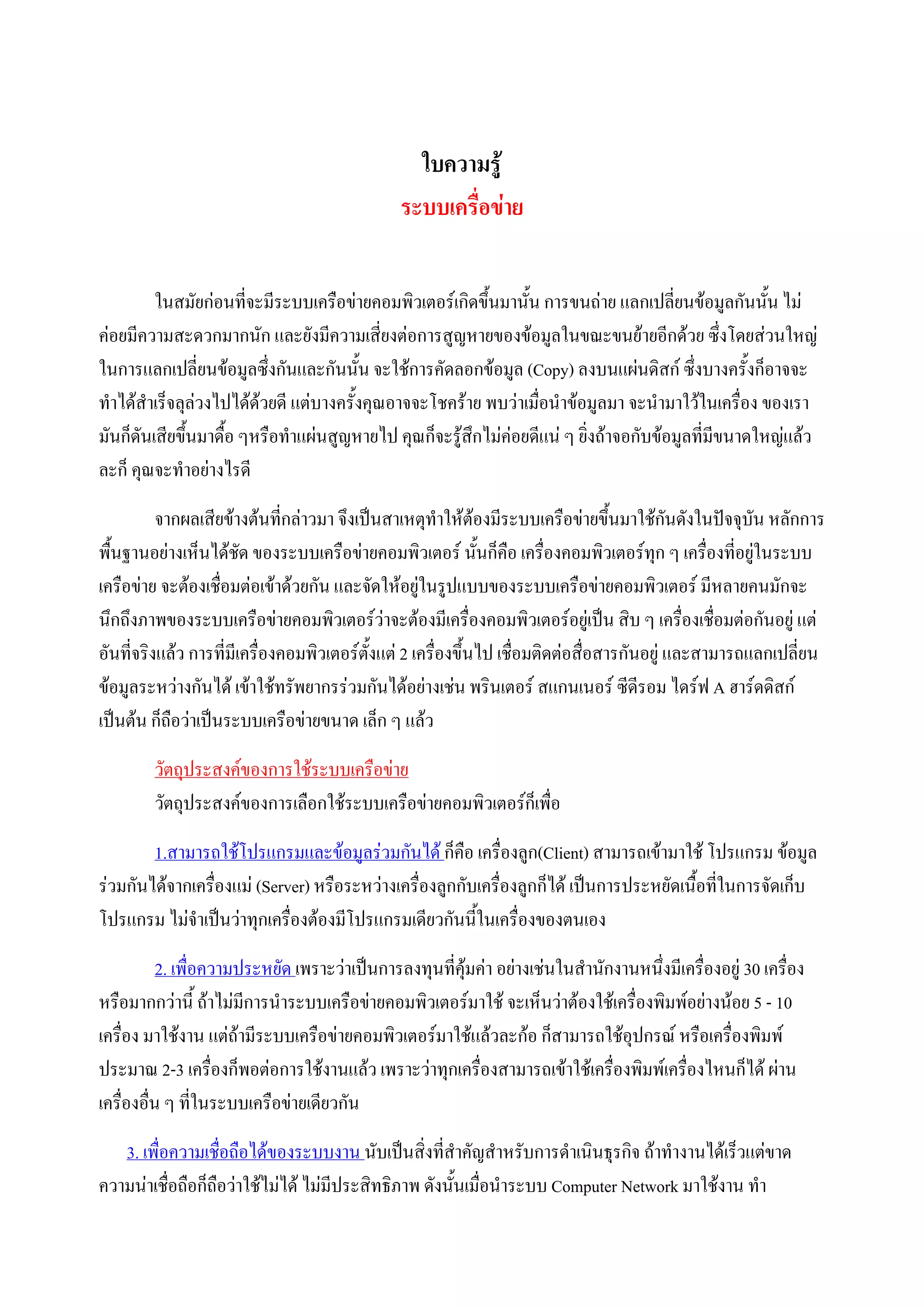 ระบบเครื่อขาย ในสมัยกอนทีจะมีระบบเครือขายคอมพิวเตอรเกิดขึ้นมานั้น การขนถาย แลกเปลี่ยนขอมูลกันนั้น ไม ่ คอยมีความสะดวกมากนัก และยังมีความเสี่ยงตอการสูญหายของขอมูลในขณะขนยายอีกดวย ซึ่งโดยสวนใหญ ในการแลกเปลี่ยนขอมูลซึ่งกันและกันนั้น จะใชการคัดลอกขอมูล (Copy) ลงบนแผนดิสก ซึ่งบางครั้งก็อาจจะ ทําไดสําเร็จลุลวงไปไดดวยดี แตบางครั้งคุณอาจจะโชคราย พบวาเมื่อนําขอมูลมา จะนํามาใวในเครื่อง ของเรา มันก็ดันเสียขึนมาดื้อ ๆหรือทําแผนสูญหายไป คุณก็จะรูสึกไมคอยดีแน ๆ ยิ่งถาจอกับขอมูลที่มีขนาดใหญแลว ้ ละก็ คุณจะทําอยางไรดี จากผลเสียขางตนที่กลาวมา จึงเปนสาเหตุทําใหตองมีระบบเครือขายขึ้นมาใชกนดังในปจจุบัน หลักการ ั พื้นฐานอยางเห็นไดชด ของระบบเครือขายคอมพิวเตอร นั้นก็คือ เครื่องคอมพิวเตอรทุก ๆ เครื่องที่อยูในระบบ ั เครือขาย จะตองเชื่อมตอเขาดวยกัน และจัดใหอยูในรูปแบบของระบบเครือขายคอมพิวเตอร มีหลายคนมักจะ นึกถึงภาพของระบบเครือขายคอมพิวเตอรวาจะตองมีเครื่องคอมพิวเตอรอยูเปน สิบ ๆ เครื่องเชื่อมตอกันอยู แต อันที่จริงแลว การที่มีเครื่องคอมพิวเตอรตงแต 2 เครื่องขึ้นไป เชื่อมติดตอสื่อสารกันอยู และสามารถแลกเปลี่ยน ั้ ขอมูลระหวางกันได เขาใชทรัพยากรรวมกันไดอยางเชน พรินเตอร สแกนเนอร ซีดีรอม ไดรฟ A ฮารดดิสก เปนตน ก็ถือวาเปนระบบเครือขายขนาด เล็ก ๆ แลว วัตถุประสงคของการใชระบบเครือขาย วัตถุประสงคของการเลือกใชระบบเครือขายคอมพิวเตอรก็เพื่อ 1.สามารถใชโปรแกรมและขอมูลรวมกันได ก็คือ เครื่องลูก(Client) สามารถเขามาใช โปรแกรม ขอมูล รวมกันไดจากเครื่องแม (Server) หรือระหวางเครื่องลูกกับเครื่องลูกก็ได เปนการประหยัดเนื้อที่ในการจัดเก็บ โปรแกรม ไมจําเปนวาทุกเครื่องตองมีโปรแกรมเดียวกันนี้ในเครื่องของตนเอง 2. เพื่อความประหยัด เพราะวาเปนการลงทุนที่คุมคา อยางเชนในสํานักงานหนึ่งมีเครื่องอยู 30 เครื่อง หรือมากกวานี้ ถาไมมีการนําระบบเครือขายคอมพิวเตอรมาใช จะเห็นวาตองใชเครื่องพิมพอยางนอย 5 - 10 เครื่อง มาใชงาน แตถามีระบบเครือขายคอมพิวเตอรมาใชแลวละกอ ก็สามารถใชอุปกรณ หรือเครื่องพิมพ ประมาณ 2-3 เครื่องก็พอตอการใชงานแลว เพราะวาทุกเครื่องสามารถเขาใชเครื่องพิมพเครื่องไหนก็ได ผาน เครื่องอื่น ๆ ที่ในระบบเครือขายเดียวกัน 3. เพื่อความเชือถือไดของระบบงาน นับเปนสิ่งที่สําคัญสําหรับการดําเนินธุรกิจ ถาทํางานไดเร็วแตขาด ่ ความนาเชื่อถือก็ถือวาใชไมได ไมมีประสิทธิภาพ ดังนั้นเมื่อนําระบบ Computer Network มาใชงาน ทํา