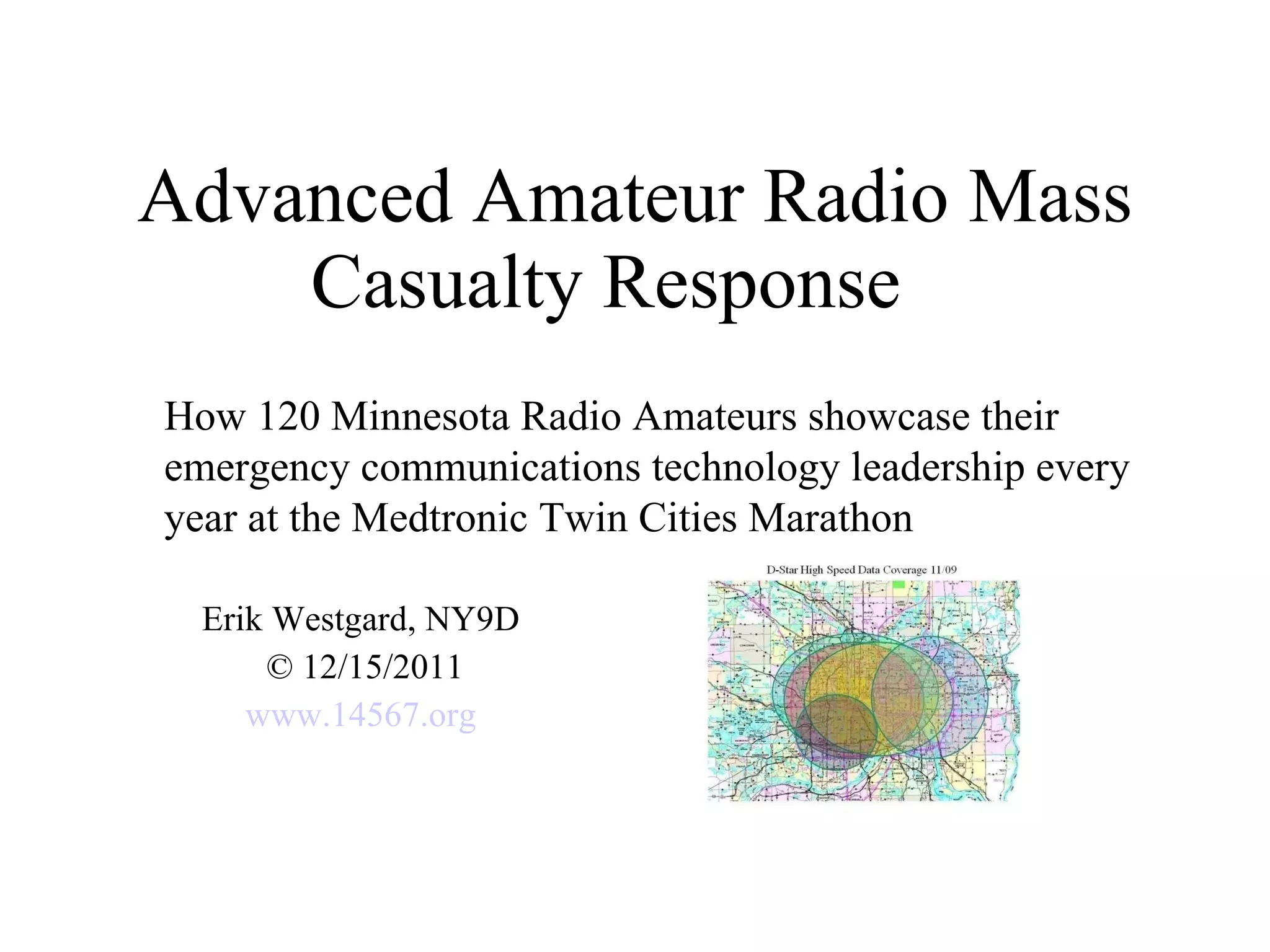The document describes how amateur radio operators provide emergency communications support for the annual Medtronic Twin Cities Marathon. It discusses: