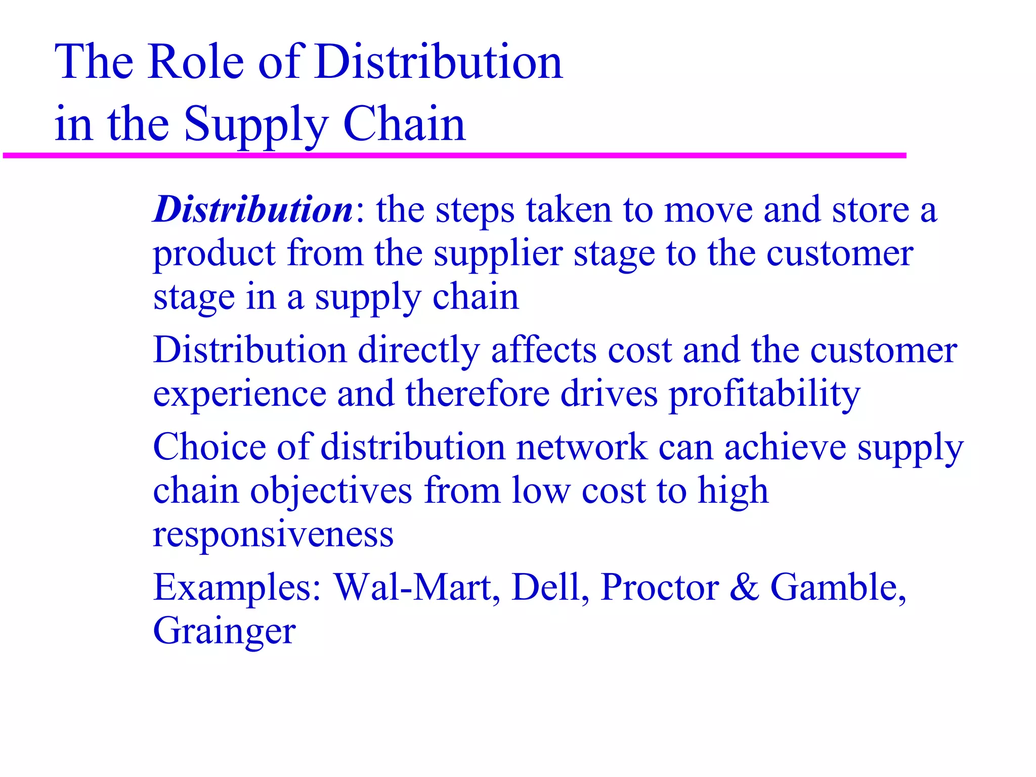 The document discusses factors that influence distribution network design for supply chains. It describes how distribution moves products from suppliers to customers and affects costs and customer experience. Distribution network performance is evaluated based on customer needs met and costs. The design must balance customer service metrics like response time, availability and order visibility with supply chain costs like inventory, transportation and facilities. Key distribution network options include direct shipping from manufacturers, distributor warehouses, and customer pickup locations. The choice of network has long-term consequences and is influenced by strategic, technological, economic and infrastructure considerations.