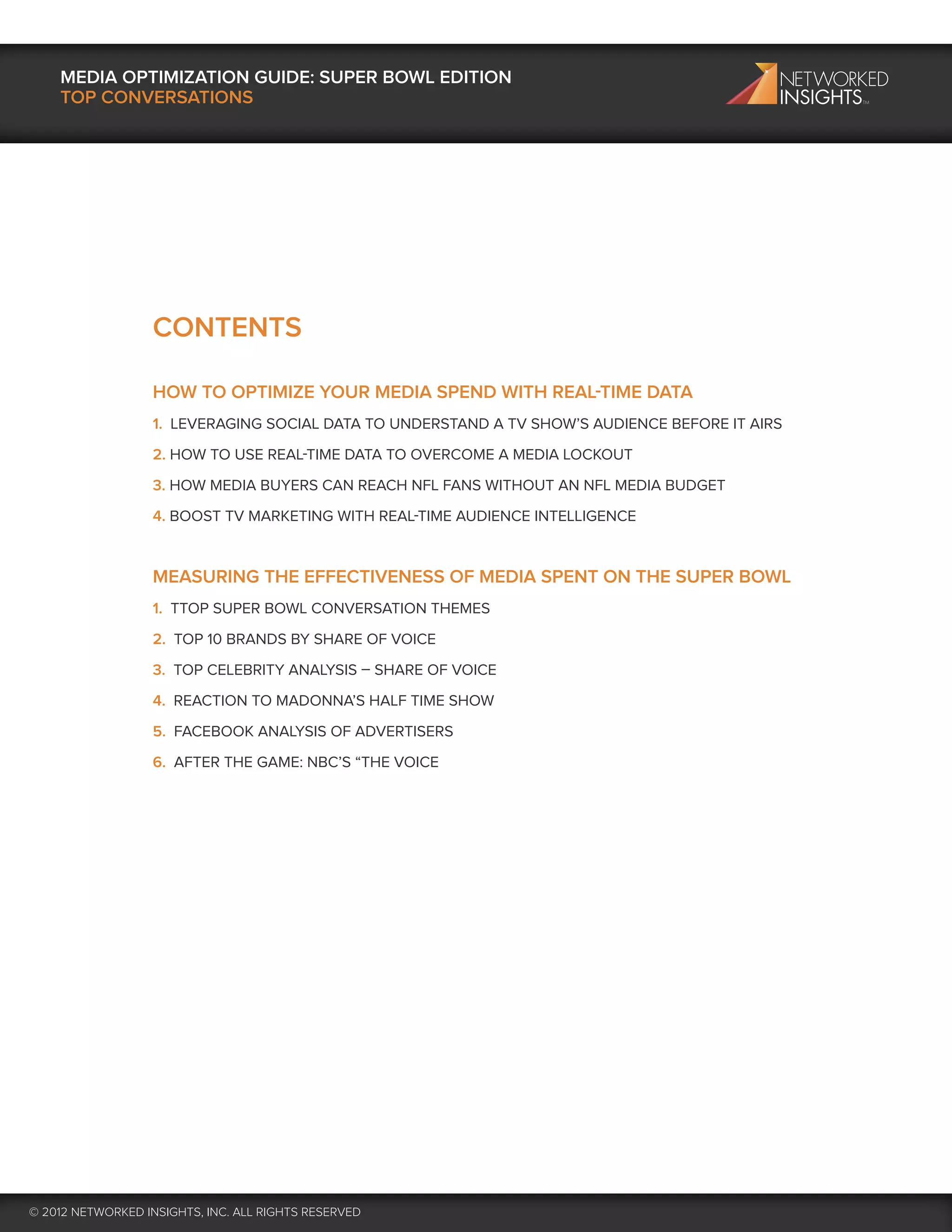 The document is a media optimization guide focusing on maximizing media spend related to the Super Bowl using real-time social data. It discusses leveraging social insights to understand audience behaviors, overcome media lockouts, and engage NFL fans economically. Additionally, it analyzes social media conversations and brand performances during the Super Bowl, highlighting effective strategies for advertisers.