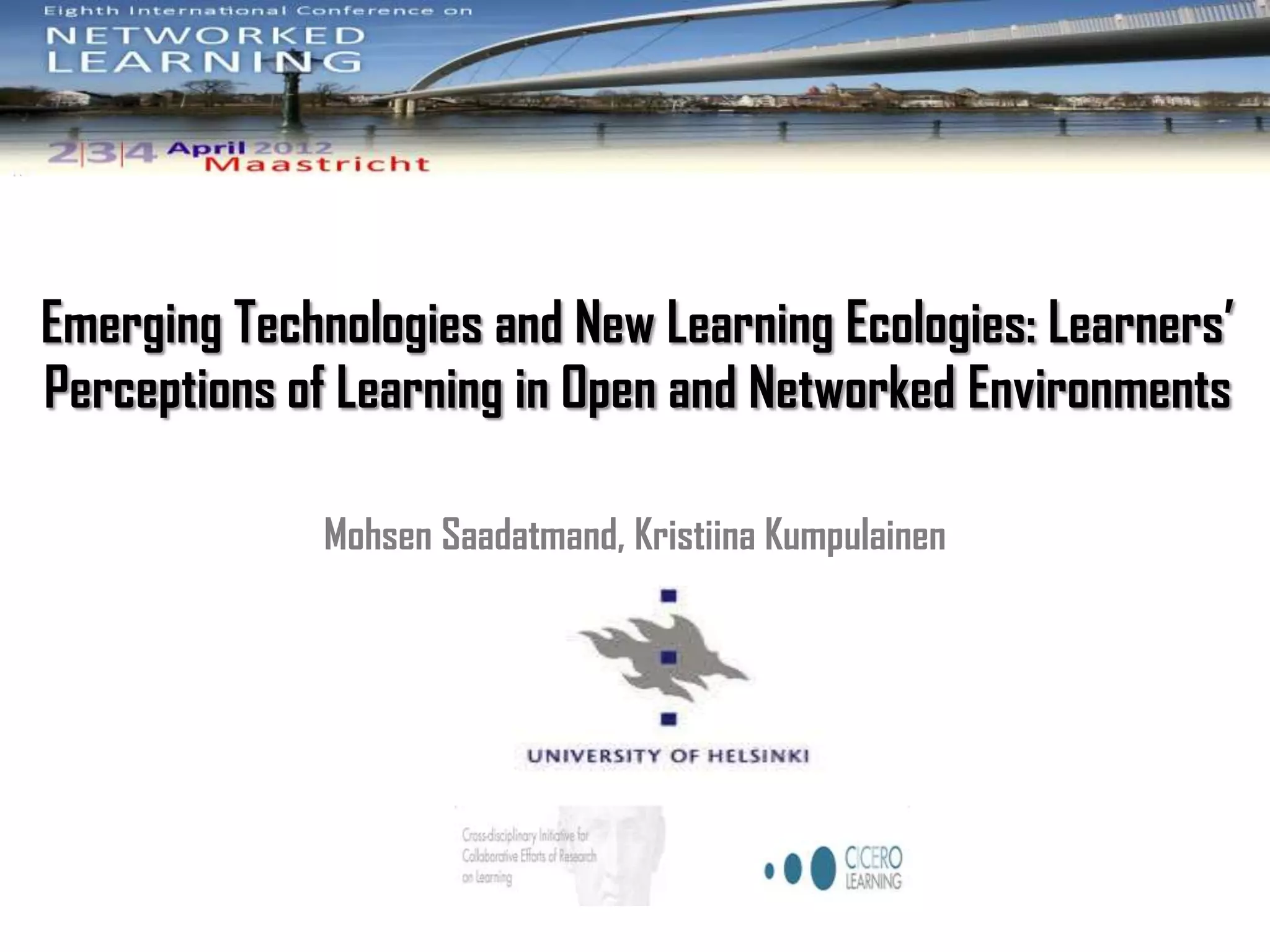 The document discusses learners' perceptions of learning in open and networked environments. It finds that such learning is connected, as learners are connected through various tools and networks to people, resources, and each other. It is also disruptive, as the unstructured nature of open learning can be challenging to manage. Learners must self-organize, determining how to learn, what tools to use, and how to develop connections. The learning is emergent and unpredictable as interactions and activities grow rhizomatically. Learners are expected to create, share, and expand their knowledge in this complex, distributed, and chaotic environment.