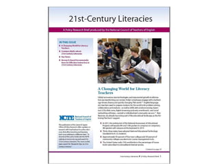 The document discusses the impact of new technologies, particularly Web 2.0 tools, on literacy and educational practices, advocating for a shift towards participatory culture in learning environments. It emphasizes that 21st-century literacies require diverse skills including collaboration, networking, and adaptability, as well as incorporating social networking as an essential educational tool. Highlighting various sources and frameworks, the document underscores the evolving nature of literacy shaped by cultural and technological changes.