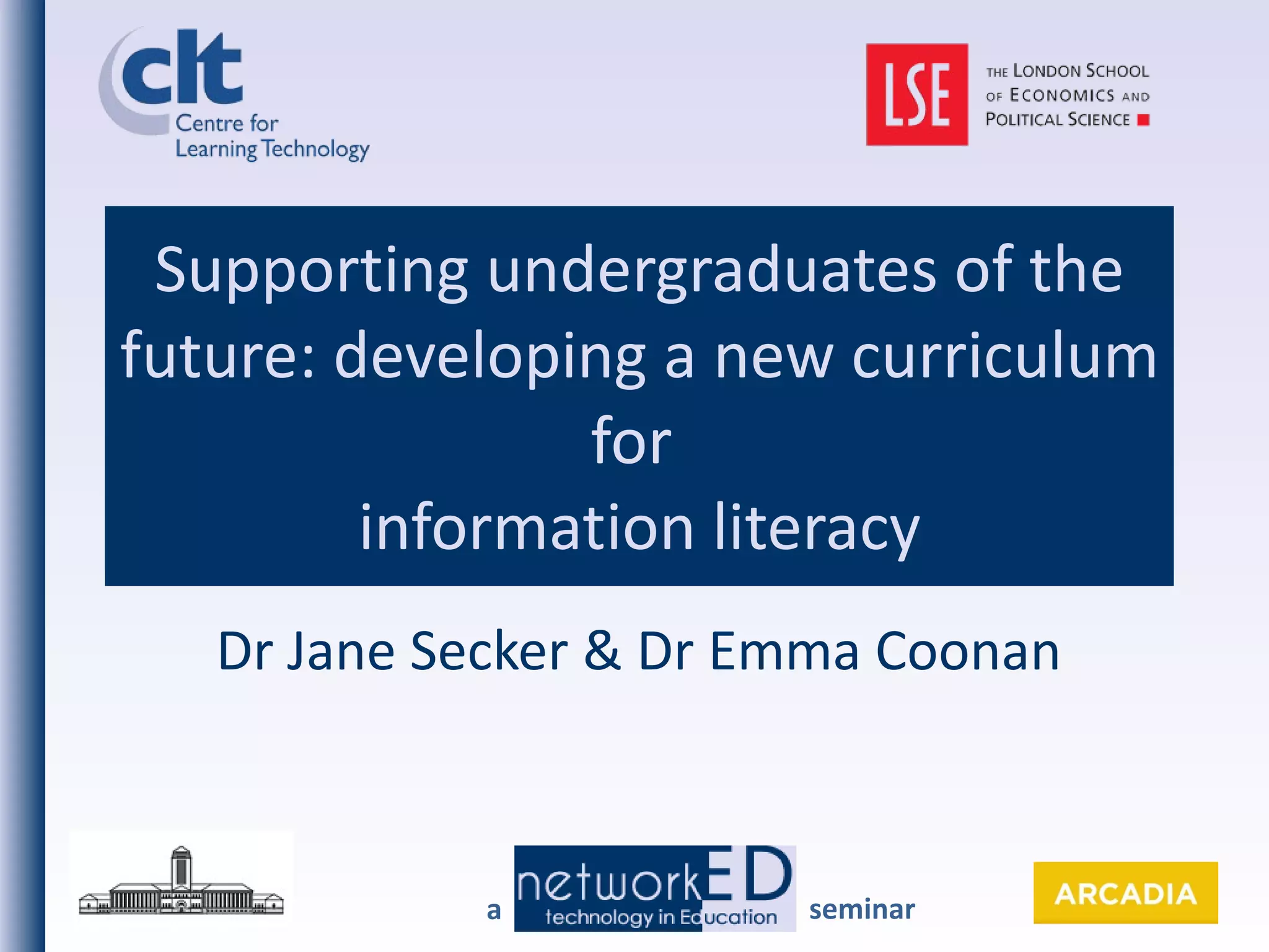 The document summarizes research conducted by Dr Jane Secker and Dr Emma Coonan to develop a new curriculum for information literacy for undergraduates entering higher education over the next 5 years. They conducted a modified Delphi study with experts in information and education fields. Based on the expert consultation, literature review, and theoretical background, they developed a modular and flexible curriculum with 6 strands covering skills from foundational to advanced. The curriculum is intended to be embedded within academic disciplines and address the real needs of students through active and assessed learning opportunities.