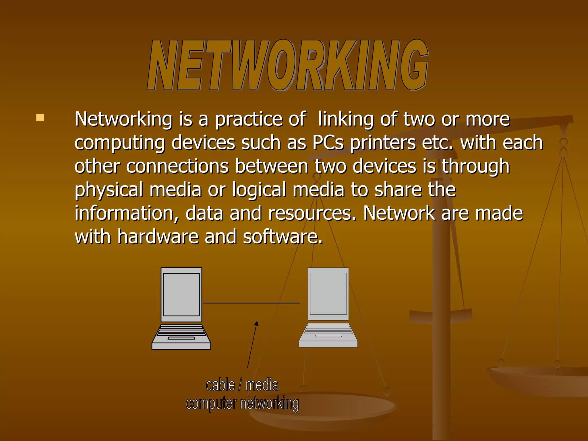 1. Networking involves connecting computing devices like PCs and printers to share information and resources using physical or logical connections.