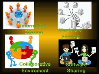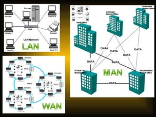 A network connects two or more computers together to share resources. Common network types include local area networks (LANs) within an office or building, metropolitan area networks (MANs) spanning a city, and wide area networks (WANs) connecting multiple LANs over a wide geographical area. Networks use physical cables or wireless technologies to transmit data and can be categorized based on their topology, protocols, and architecture. Benefits of networks include information and hardware sharing while risks include security issues and equipment failures.