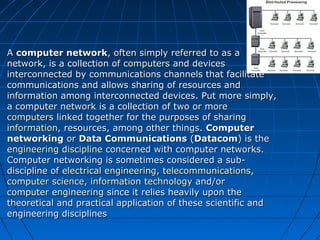 This document provides information about various types of computer networks and networking components. It defines what a computer network is and describes local area networks (LANs) and wide area networks (WANs). It also discusses networking hardware components like network interface cards, hubs, bridges, switches, and routers. Additionally, it covers specific network types such as campus networks, backbones, metropolitan area networks, virtual private networks, and the internet.