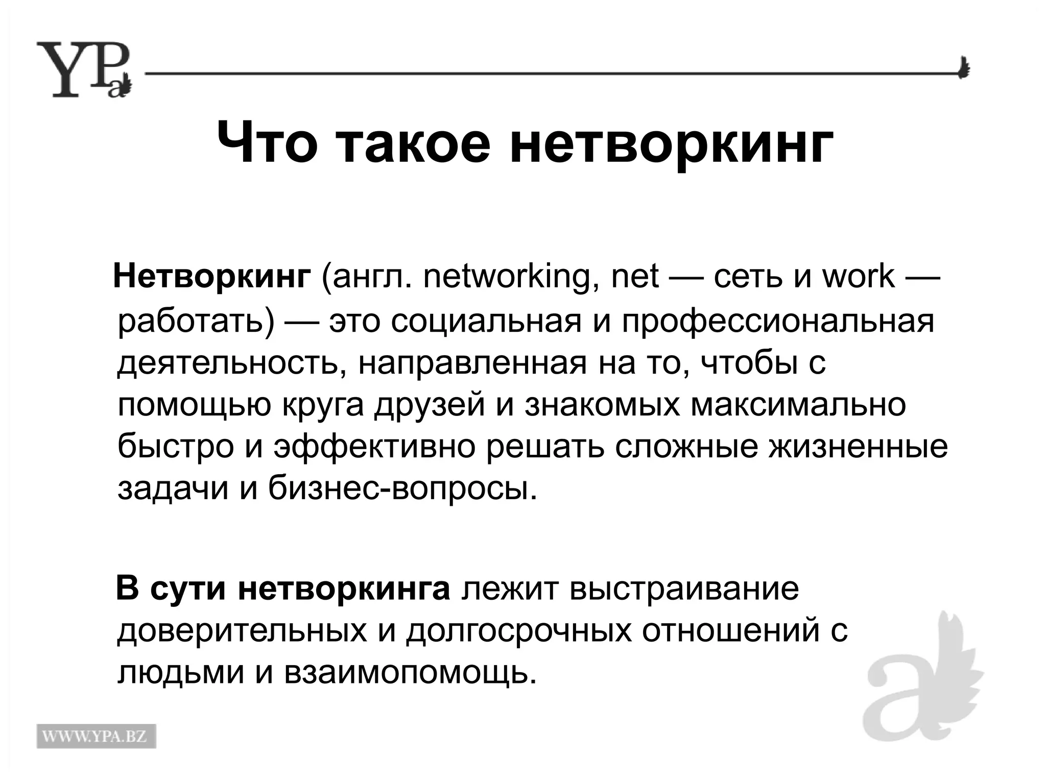 Документ описывает концепцию нетворкинга как важного аспекта профессиональной и социальной деятельности, подчеркивая его роль в создании доверительных отношений и взаимопомощи. Он включает четыре основных этапа: подготовка, работа на мероприятии, работа с новыми контактами после мероприятия и анализ результатов. Также рассматриваются советы по использованию социальных сетей для эффективного нетворкинга.
