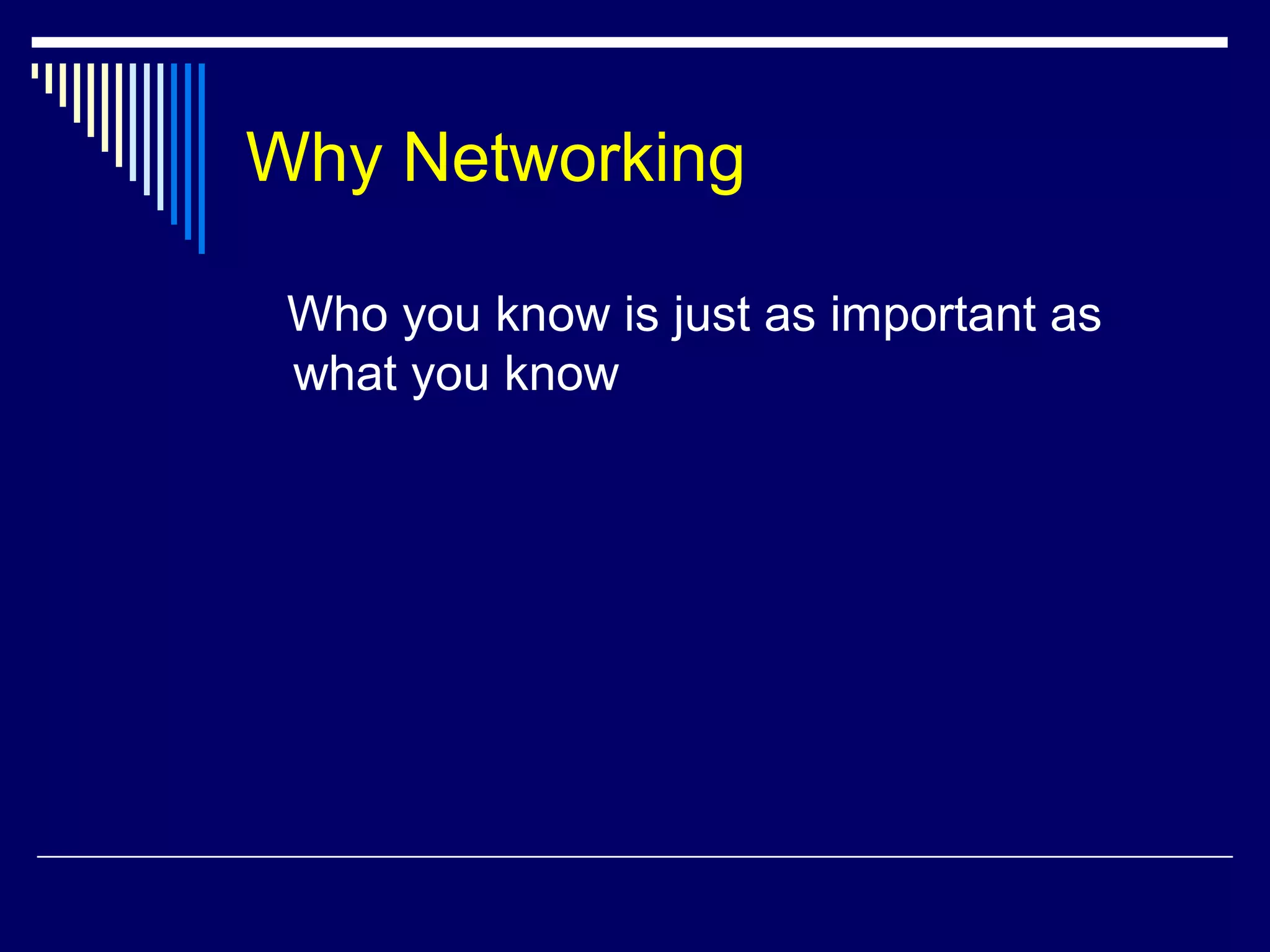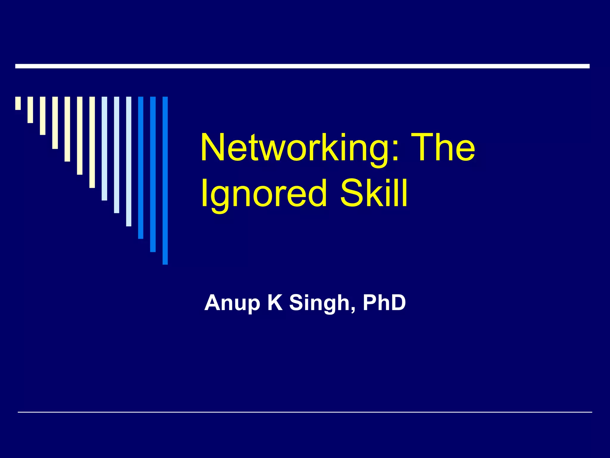 The document discusses the importance of networking, emphasizing that who you know is as crucial as what you know for achieving professional tasks and objectives. It explains different types of networks—operational, personal, and strategic—and highlights the advantages of networking, such as access to information and social support. It also provides guidance on effective networking strategies, including establishing connections and valuing relationships.