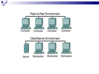 A network is an interconnection of devices that allows communication between them to share network resources. There are different types of networks including local area networks (LANs) that connect devices within a small geographic area like a home or office, and wide area networks (WANs) that connect multiple LANs across cities or countries. Network devices like hubs, switches, and routers help facilitate this connectivity, with switches improving on hubs by only sending traffic to the intended recipient device to avoid congestion. Various cable types like coaxial, twisted pair, and fiber optic are used to physically connect the network devices and components.