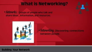 The document outlines the importance of networking, offering tips on preparation, conversation starters, and how to cultivate meaningful relationships. Key strategies include having a clear elevator speech, engaging actively in conversations, and maintaining connections without expecting favors. It emphasizes that networking requires practice and the ability to read social cues.