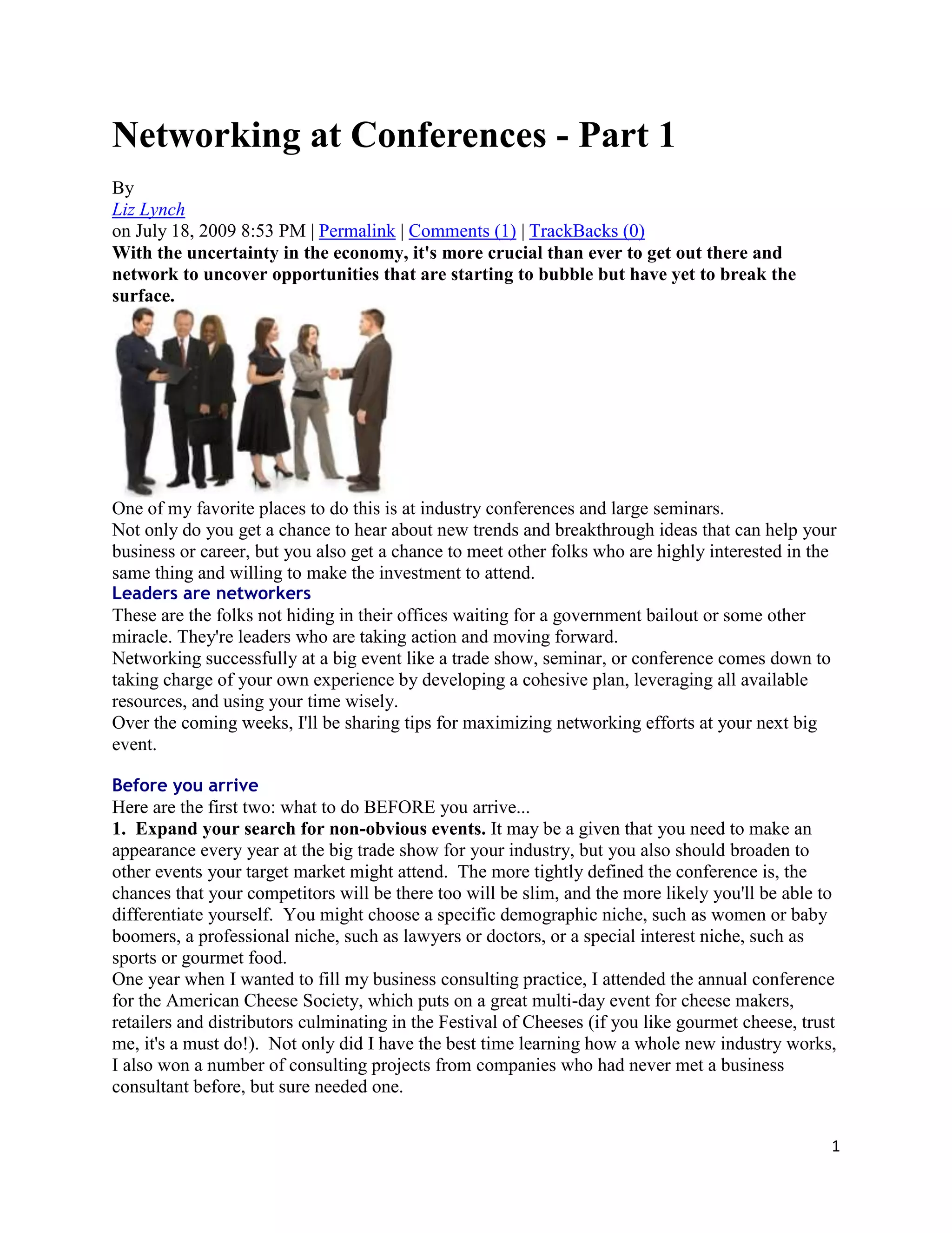 The document provides tips for maximizing networking at conferences and industry events. It recommends expanding your search for niche events to differentiate yourself, clarifying your goals beforehand, focusing discussions on others' interests rather than selling, getting the right people to approach you by introducing yourself during Q&A sessions, and leveraging conference organizers' help to meet your objectives. The key takeaway is that preparation, clear goals, active listening, and strategic introductions can lead to high-impact connections.