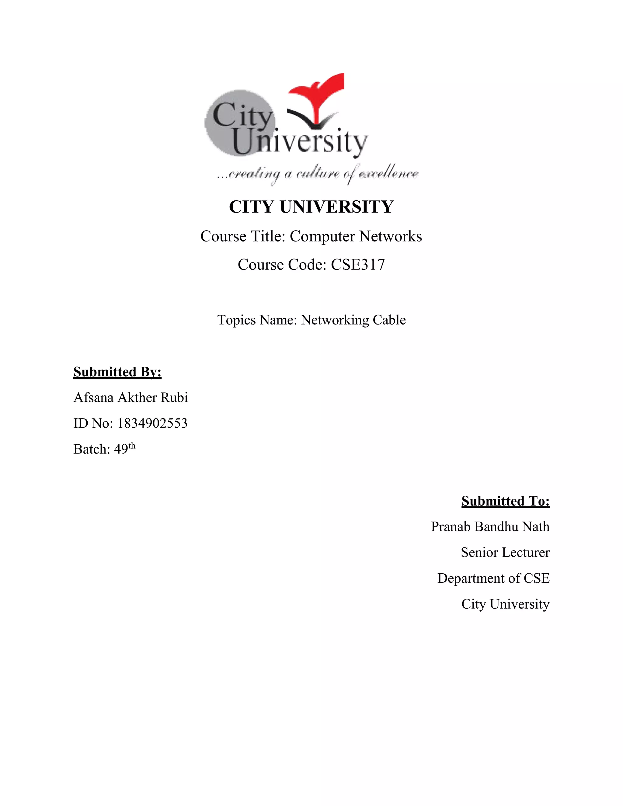 The document discusses network cabling, focusing on various types such as unshielded twisted pair (UTP), shielded twisted pair (STP), coaxial, and fiber optic cables, along with installation guides. It highlights UTP as the most common type, STP's advantage in reducing noise, and the specific standards for coaxial cables. Additionally, the document covers wireless LANs, emphasizing their reliance on radio waves for connectivity within limited areas.