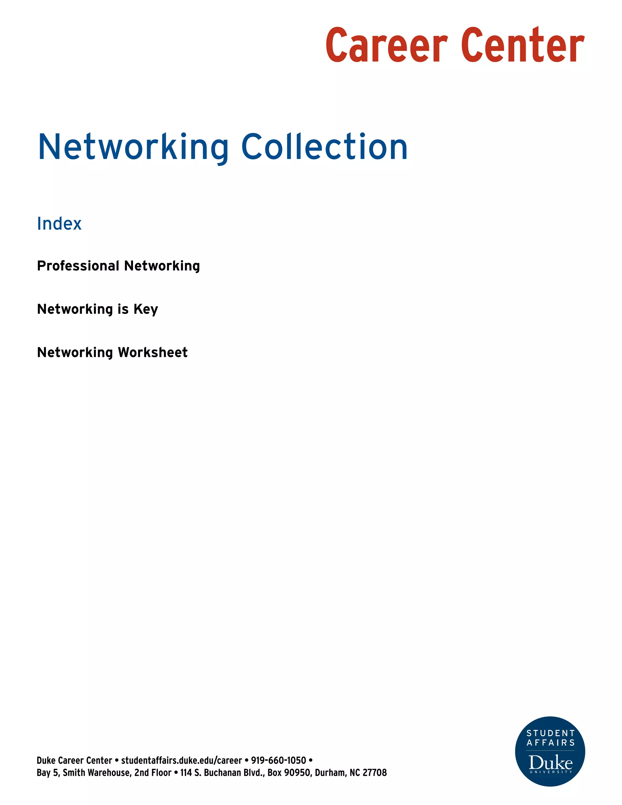 The document provides guidance on professional networking from the Duke Career Center. It discusses that networking is an important tool for finding internships, jobs, and other opportunities. The document offers 13 steps for effective networking, including knowing yourself, making a list of current relationships, doing research on contacts, drafting an introduction, following up, maintaining connections, and being patient. Networking worksheets are also included to help students identify their network and prepare for networking conversations.
