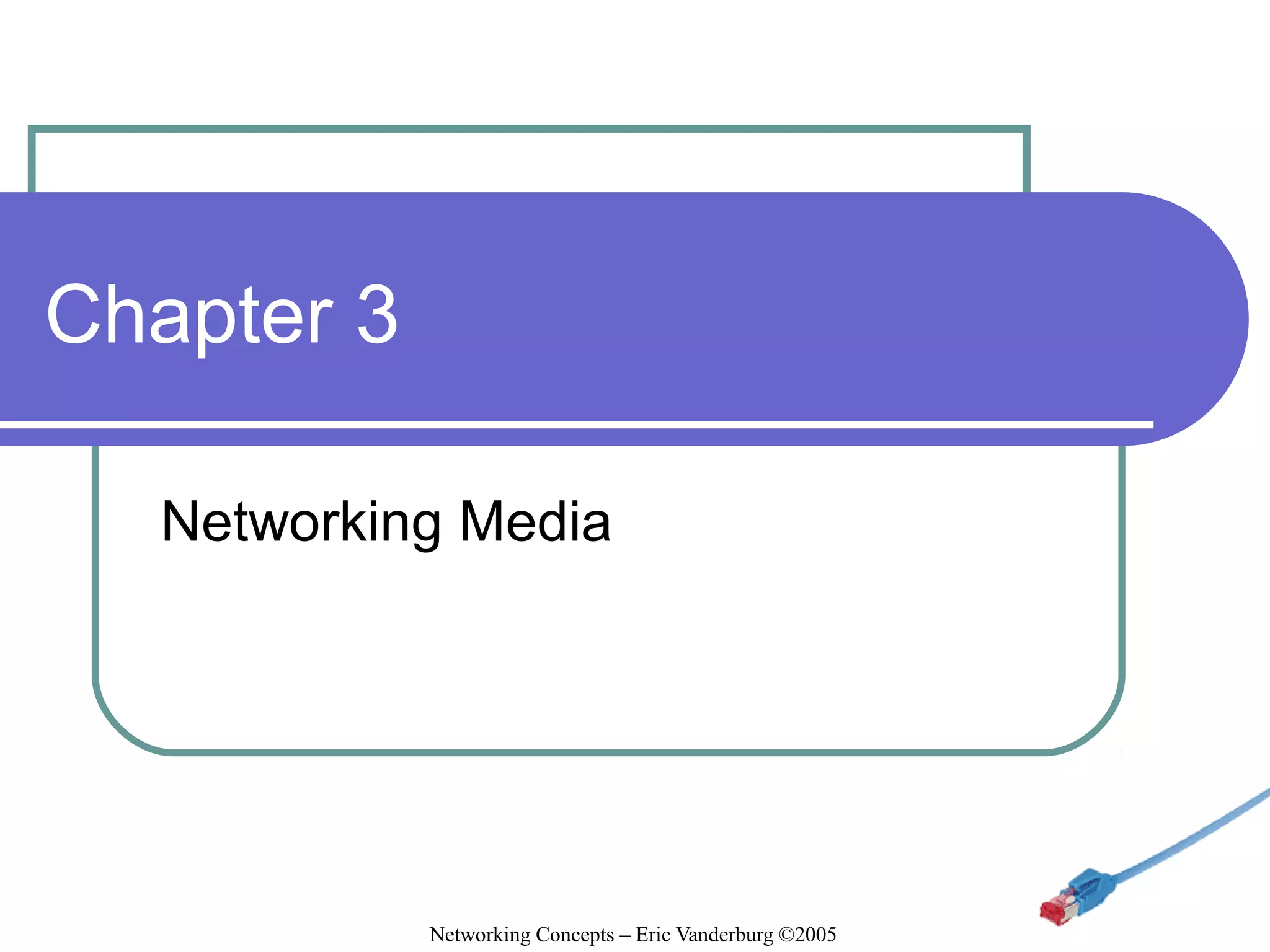 This document discusses various networking media options. It covers wired options like twisted pair cable, coaxial cable, and fiber optic cable. It discusses characteristics of each type and standards like Cat5 and fiber connectors. It also covers wireless options including infrared, radio technologies like 802.11, spread spectrum, and microwave networks. It provides brief summaries of each type's speed, range, installation complexity and cost to help inform choices for a given network environment.