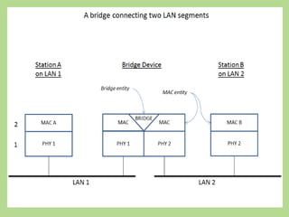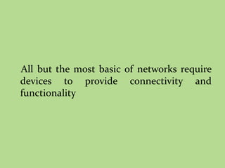 This document discusses several common networking devices and their functions. It describes hubs, switches, bridges, routers, gateways, CSU/DSUs, NICs, ISDN adapters, modems, and firewalls. Hubs broadcast traffic to all ports, wasting bandwidth, while switches only forward frames to their destination port. Bridges operate at the data link layer and routers at the network layer. Gateways perform protocol translation. NICs connect devices to the network. Modems convert digital to analog signals for transmission over phone lines. Firewalls control network access for security.