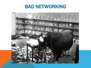 This document provides tips and strategies for effective networking. It discusses that networking is the exchange of information and resources, not cold calling or selling. Networking is important because the job market is competitive and winning work often comes through relationships. The document then provides tips for introverts on how their qualities can help them network, as well as overall networking strategies like making it a priority, listening to others, maintaining character, and having an elevator speech prepared. It stresses preparing a game plan on where and how to network, maintaining contacts, and following up as the most important aspect.