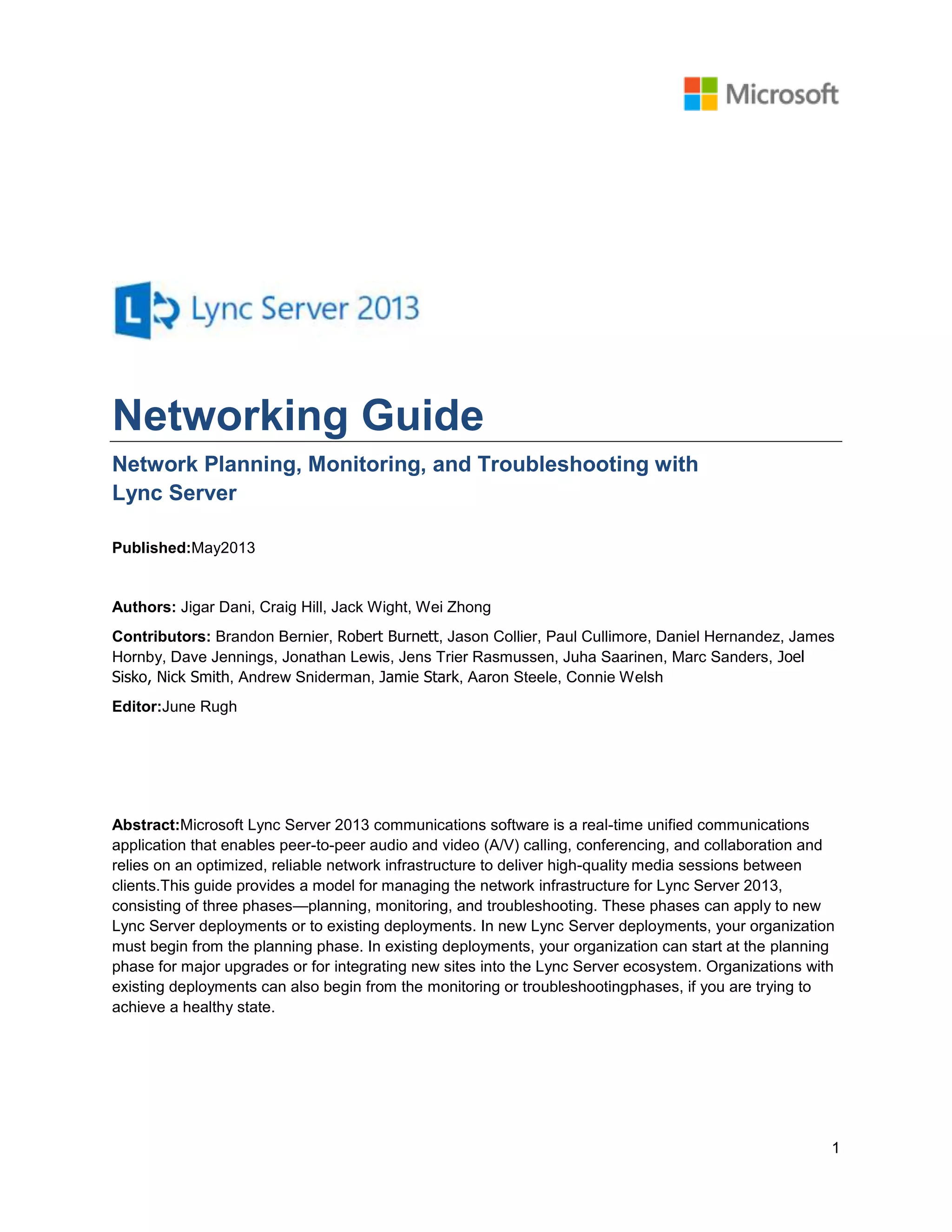 This document provides a guide for planning, monitoring, and troubleshooting a network infrastructure to support Microsoft Lync Server 2013 communications software. It discusses phases for managing the network, including planning, deployment and monitoring, and troubleshooting. The planning phase involves tasks such as network discovery, modeling usage, estimating bandwidth needs, simulating traffic, and configuring quality of service, ports, and call admission control. The deployment and monitoring phase discusses elements to monitor like server health, network performance, and client health. It also addresses configuration auditing and trend reporting. The troubleshooting phase provides approaches for addressing issues at different scopes from site-wide to individual calls, and methodologies for troubleshooting various network, device, and environmental problems.