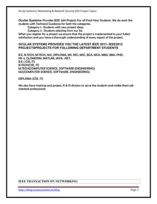 This document provides a list of over 100 potential IEEE networking and security project topics for final year students in various computer science and engineering programs. It includes topics such as adaptive fault-tolerant QoS control algorithms, adjacent link failure localization, energy efficient opportunistic routing in wireless sensor networks, and optimal anycast technique for delay-sensitive energy-constrained asynchronous sensor networks. The document also provides contact information for the company Ocular Systems, which assists students with IEEE projects.