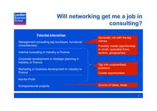 The document discusses strategies for effective networking to secure summer internships, particularly in consulting and other industries. It emphasizes the importance of building relationships, utilizing various networking platforms, and having a clear action plan to broaden one's professional network. Additionally, it highlights the need for clarity in personal goals and mutual offers in networking interactions.