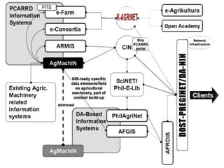 This document outlines information networking strategies for farmers in the Philippines. It discusses existing information networks like HORTINET and AgMachIN and knowledge networks like K-AGRINET. K-AGRINET aims to help modernize agriculture through strengthening extension models, distance learning, and connecting government infrastructure. The document also discusses farmers' roles in information networking through farmer scientists in FITS Centers and e-Agrikultura centers. It concludes by discussing future e-extension strategies such as a farmers' call center, e-learning courses, and a mobile internet bus to improve farmers' access to information.