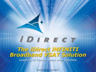 The document discusses iDirect's iNFINITI broadband VSAT solution. It notes that iDirect has established a dominant position in driving the satellite industry's IP revolution. The iNFINITI solution provides high-speed, multi-media services over satellite networks using voice, video and data. It supports topologies like star, mesh and point-to-point networks with high performance and security. The document highlights iDirect's technology leadership, feature-rich portfolio and large customer base in the government and commercial sectors.