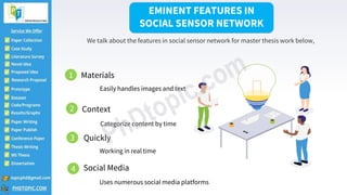The document discusses a master thesis topic related to network simulators focused on social sensor networks in the UK. It outlines key features such as context categorization, real-time processing, and the accuracy of sensor readings, while also highlighting vital applications including environmental monitoring and smart cities. The content serves as a resource for students pursuing their masters in this field.