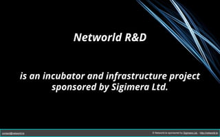 Networld R&D is an incubator project sponsored by Sigimera Ltd that started in 2006 as a BitTorrent tracker and has expanded to include projects such as MokSec in 2008, Android app development in 2010, and launching a Platform as a Service in 2014. The document provides an overview of Networld R&D's timeline and projects as well as contact information.