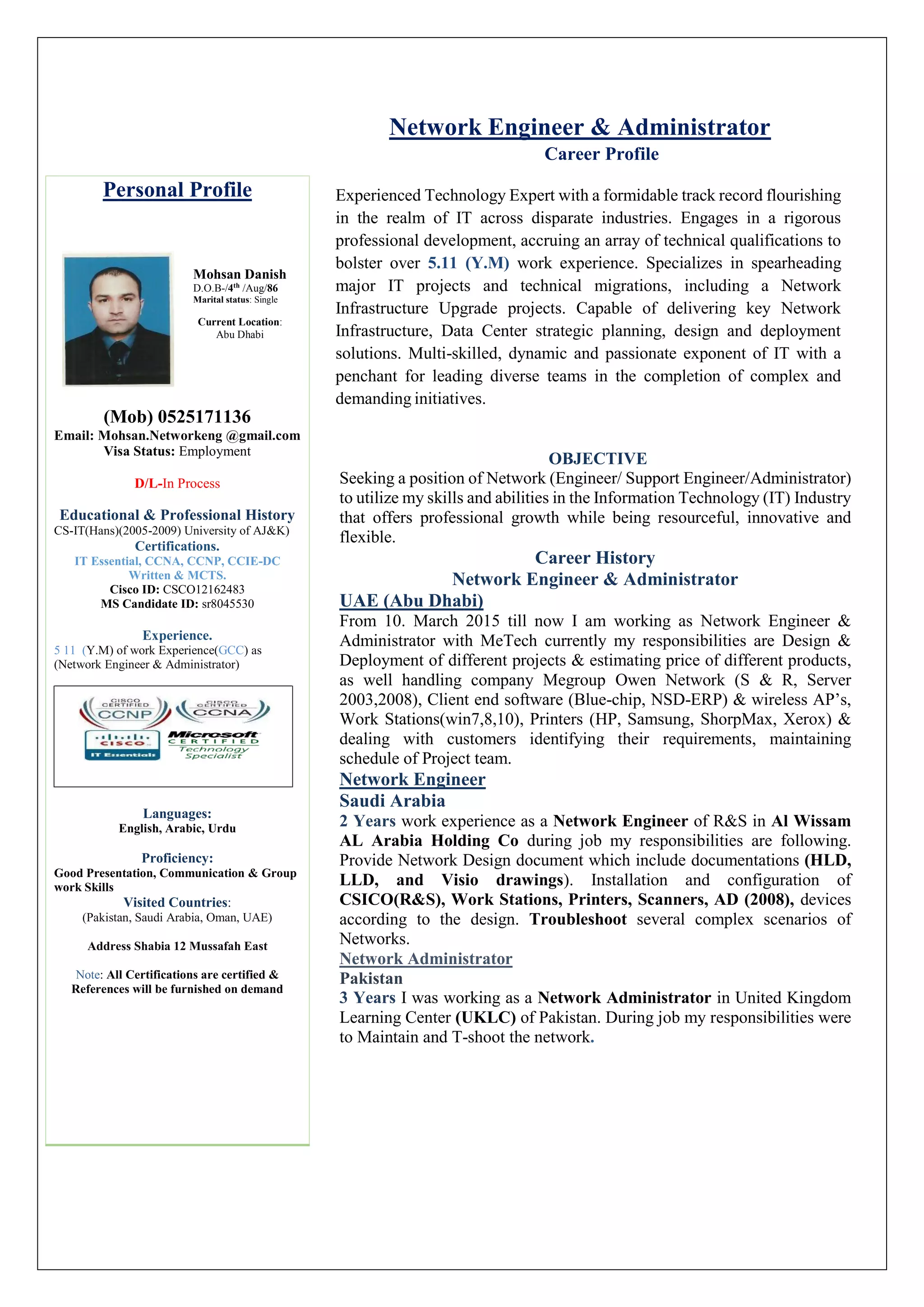 The document outlines the career profile of Mohsan Danish, a network engineer and administrator with over 5 years of experience in IT across multiple industries, skilled in managing major IT projects and network infrastructure upgrades. He has a solid educational background, numerous technical certifications, and has successfully worked on projects in various countries, including Saudi Arabia and Pakistan. Mohsan seeks a position that utilizes his extensive skills and offers opportunities for professional growth while contributing to innovative IT solutions.