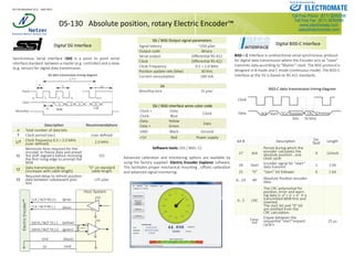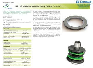 The DS-130 is a low profile, hollow shaft, absolute position electric encoder based on Netzer Precision's proprietary technology. It offers high resolution and precision, wide operating temperature range, and high tolerance to shock and vibration. The encoder has no bearings or other contacting elements, requires low power, and is virtually failure proof. It provides analog sine/cosine outputs and digital position data via SSI or BiSS-C interfaces. The encoder is well suited for applications requiring precision, reliability, and small size such as medical and aerospace equipment.