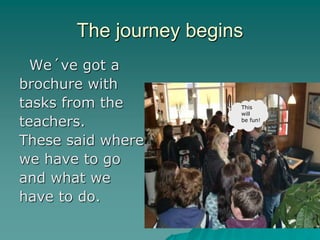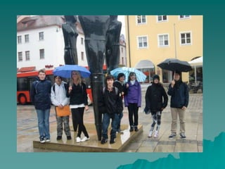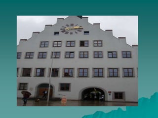 The document provides information about a virtual town walk through Neumarkt, Germany. It details 3 stations on the walk: Station 1 discusses Neumarkt's history as an important trade route in the Middle Ages and buildings constructed in 1410. Station 2 describes the town hall, noting it was originally built in 1430 but reconstructed in 1950 and renovated in 1990. Station 3 gives details about the Church of St. John, including when it was built from 1404 to 1434, its 11 stone pillars, 72-meter tall tower, and 222 steps in the tower.