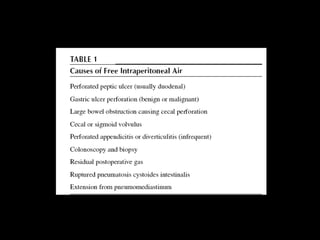 This document discusses pneumoperitoneum, which refers to free gas in the peritoneal cavity. It can be caused by a perforated abdominal viscus and is a medical emergency. The best way to detect free intraperitoneal air is with an upright chest x-ray. There are several signs visible on imaging that can indicate the presence of pneumoperitoneum, including air in the subhepatic space, Morrison's pouch, or beneath the diaphragm. The case review describes a patient presenting with abdominal pain and distention who is found to have pneumoperitoneum on chest x-ray.