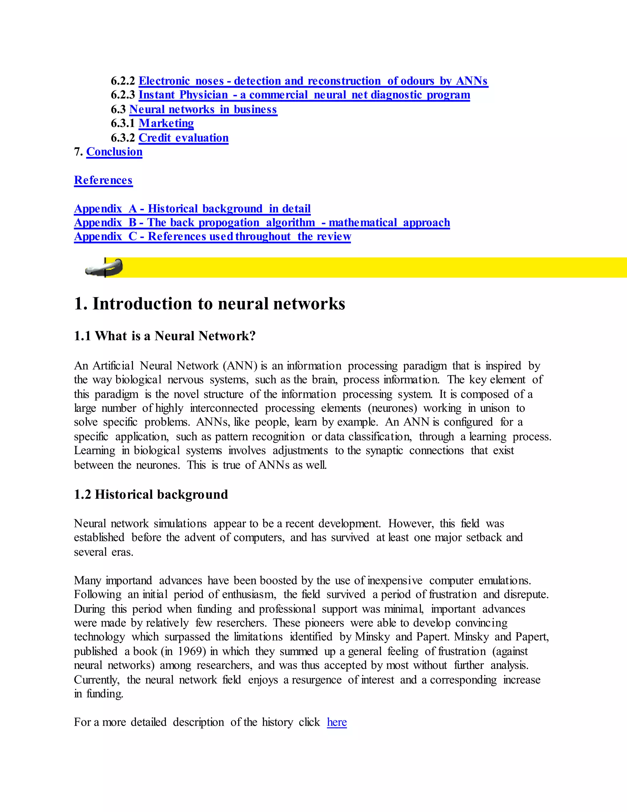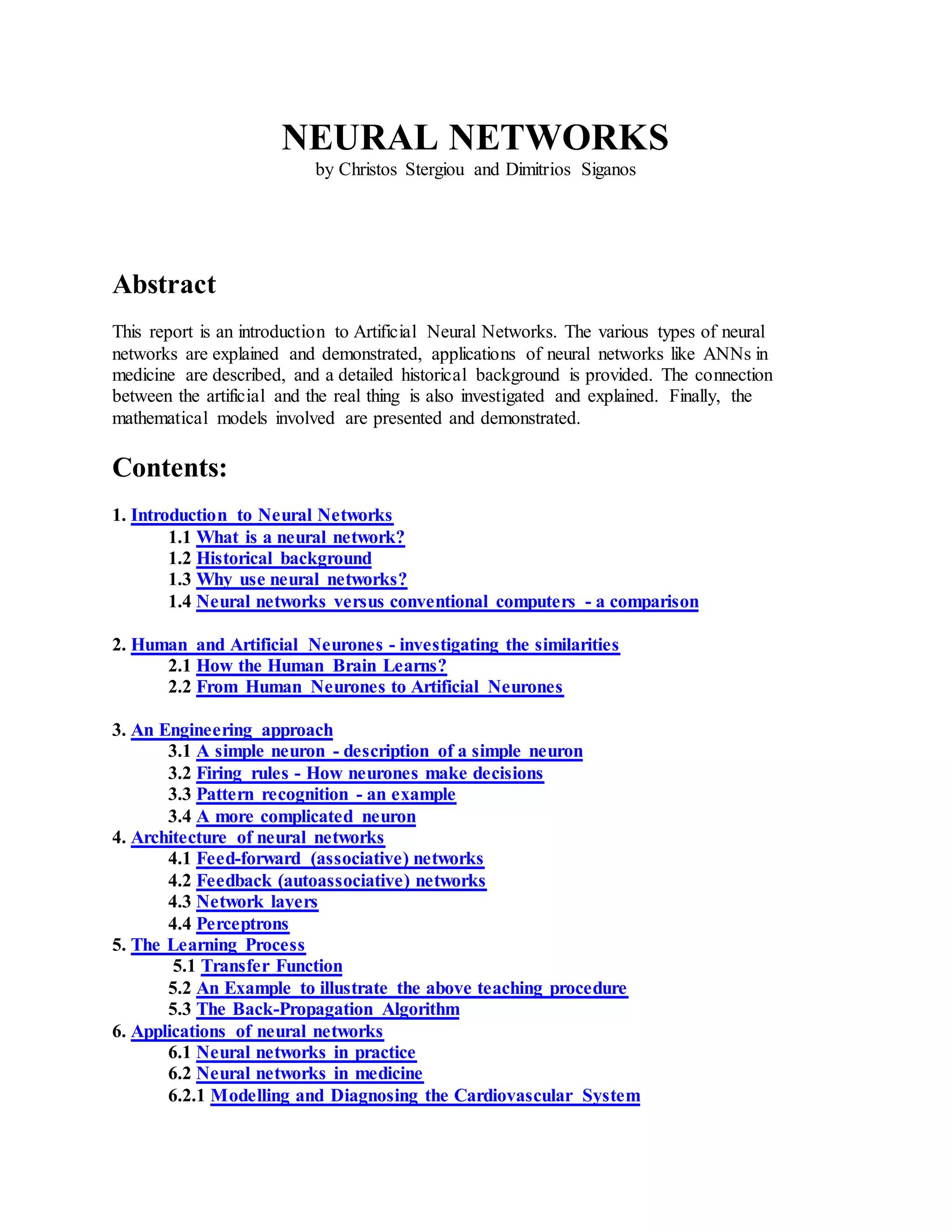 This document provides an introduction to artificial neural networks. It describes how neural networks are inspired by and similar to the human brain, yet take a different approach to problem solving than conventional computers. The document outlines various types of neural network architectures and applications of neural networks in areas like medicine, business, and pattern recognition. It also provides historical background on the development of neural networks and compares their abilities to conventional algorithms.