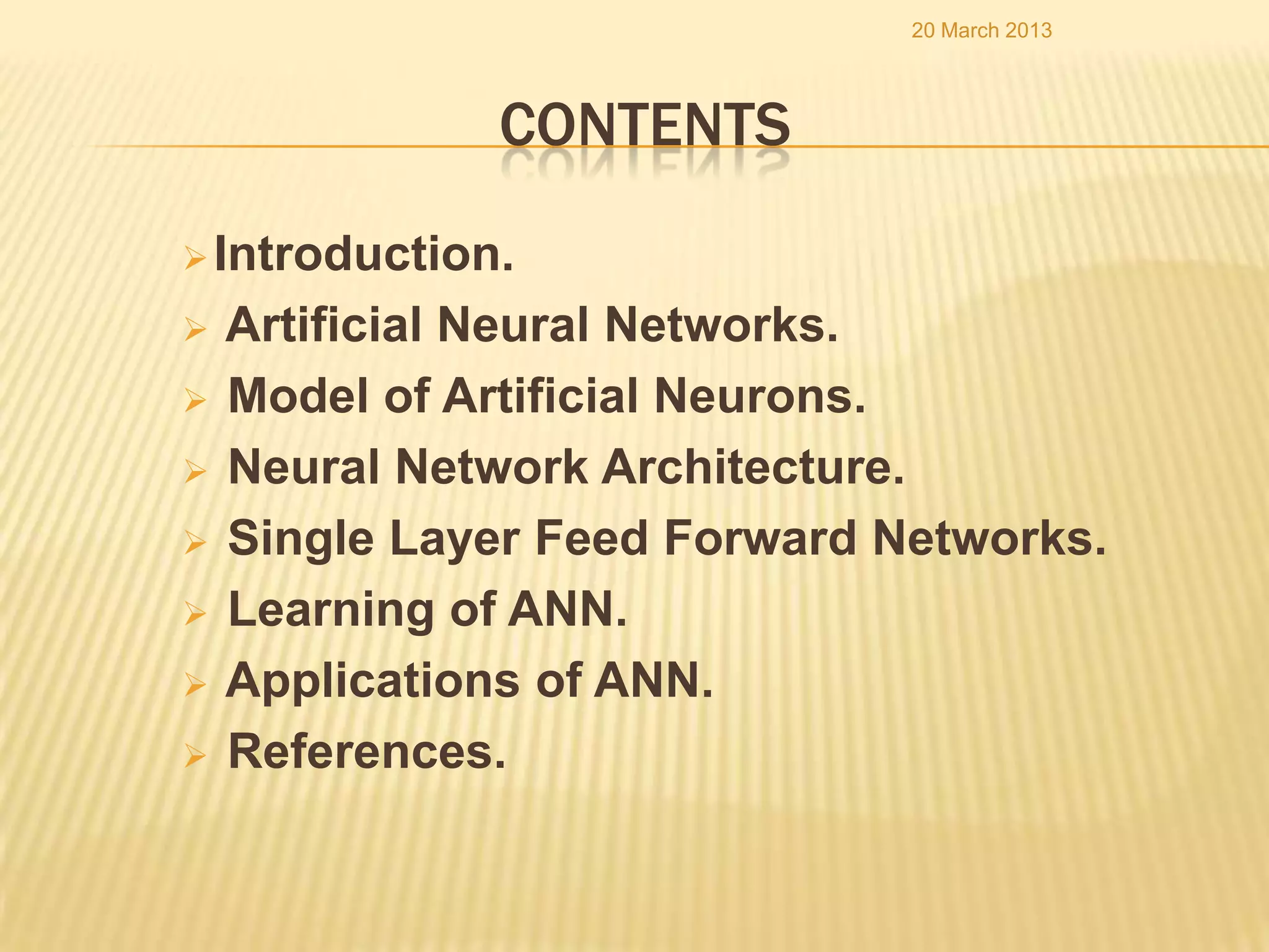 The document provides an overview of neural networks, including their architecture, models of artificial neurons, and learning methods. It describes different types of neural networks such as single-layer feedforward networks and discusses their applications in various fields like character recognition and stock market prediction. References for further reading are also included.