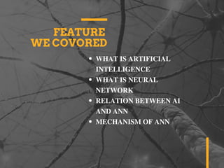 This document discusses neural networks and artificial intelligence. It defines artificial intelligence as machines programmed to think like humans, and neural networks as computational models inspired by the human brain. The document explains that neural networks are used in artificial intelligence to help machines solve complex problems. It then provides details on the basic structure and learning mechanisms of neural networks, describing how networks are composed of interconnected neurons that can learn from examples to perform tasks like pattern recognition.