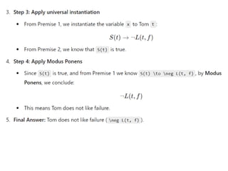 The document discusses key concepts in artificial intelligence, particularly propositional logic and rule-based systems. Propositional logic is essential for representing facts and reasoning, while rule-based systems utilize predefined rules for decision-making in domains like medical diagnosis. It also covers knowledge representation, types of knowledge in AI, and various reasoning methods, including deductive and inductive reasoning.